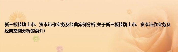 新三板挂牌上市、资本运作实务及经典案例分析(关于新三板挂牌上市、资本运作实务及经典案例分析的简介)