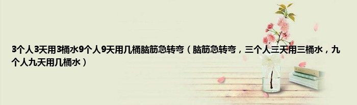 答案是:九个人九天用27桶水。该题类似于脑筋急转弯,但实际上是一个数学计算的问题。根据题意,三个人三天用3桶水,那么可以得知:一个人三天用1桶水。进而可推出一个人九天用了1×3=3桶水,那么九个人九天用了9×3=27桶水。解答这个问题不能马上就按照字面意思去理解,三个人三天用三桶水,很多人下一个反应就是:九个人九天用九桶水,但实际上这是一个错误的答案,这个题目里面包含了一个数学计算的过程,而不是单纯的挖题目的字眼就能说出答案来。扩展资料:这个问题可以从多个方向可以解答,因为题目本身就缺乏严谨,但是各个方法求得的结果都是一致的。方法一:三个人三天用3桶水,可以理解为:三个人一天用1桶水。那么三个人九天用1×9=9桶水,所以九个人九天用了3×9=27桶水。方法二:三个人三天用3桶水,可以理解为:一个人一天用1/3桶水,那么九个人一天用(1/3)×9=3桶水,那么九个人九天用3×9=27桶水。垍