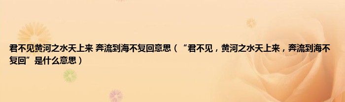 “君不见,黄河之水天上来,奔流到海不复回”意思是:你没看见吗?黄河之水是由天上而来。波涛滚滚奔向东海,永不回头。李白的《将进酒》道出了黄河一泻万里的冲天气势和辉映日月的生命豪情。特别是它是奔流到海的历程,遭遇了多少坎坷,多少阻遏!润泽了多少土地,多少生命!选自【唐】李白《将进酒》:君不见,黄河之水天上来,奔流到海不复回。君不见,高堂明镜悲白发,朝如青丝暮成雪。人生得意须尽欢,莫使金樽空对月。天生我材必有用,千金散尽还复来。烹羊宰牛且为乐,会须一饮三百杯。岑夫子,丹丘生,将进酒,君莫停。与君歌一曲,请君为我侧耳听。钟鼓馔玉不足贵,但愿长醉不愿醒。古来圣贤皆寂寞,惟有饮者留其名。陈王昔时宴平乐,斗酒十千恣欢谑。主人何为言少钱,径须沽取对君酌。五花马,千金裘,呼儿将出换美酒,与尔同销万古愁。李白(701年-762年),字太白,号青莲居士,又号“谪仙人”,是唐代伟大的浪漫主义诗人,被后人誉为“诗仙”,与杜甫并称为“李杜”,为了与另两位诗人李商隐与杜牧即“小李杜”区别,杜甫与李白又合称“大李杜”。其人爽朗大方,爱饮酒作诗,喜交友。