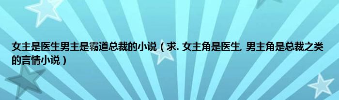 大家好,小常来为大家解答以上问题。女主是医生男主是霸道总裁的小说,求. 女主角是医生, 男主角是总裁之类的言情小说很多人还不知道,现在让我们一起来看看吧!