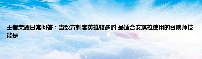 小编今天给各位玩家朋友们带来的是王者荣耀日常问答:当敌方刺客英雄较多时,最适合安琪拉使用的召唤师技能是,有记得的玩家朋友吗?不记得也没有关系,小编已经帮助大家把王者荣耀日常问答:当敌方刺客英雄较多时,最适合安琪拉使用的召唤师技能是找了出来,你只需要动动你的小手就可以轻松知道啦,快来瞧一瞧吧。