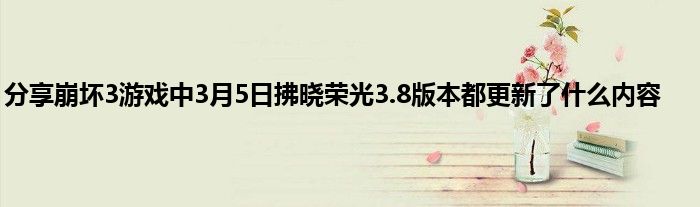 今天弟哥来聊聊一篇关于崩坏3游戏中3月5日拂晓荣光3.8版本都更新了什么内容的文章,游戏是很多人的选择,但是游戏玩多了也会身心疲惫,现在就为大家来简单介绍下崩坏3游戏中3月5日拂晓荣光3.8版本都更新了什么内容,希望对各位小伙伴们有所帮助。