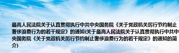 本文关于最高人民法院关于认真贯彻执行中共中央国务院《关于党政机关厉行节约制止奢侈浪费行为的若干规定》的通知的简介就讲解完毕,希望对大家有所帮助。