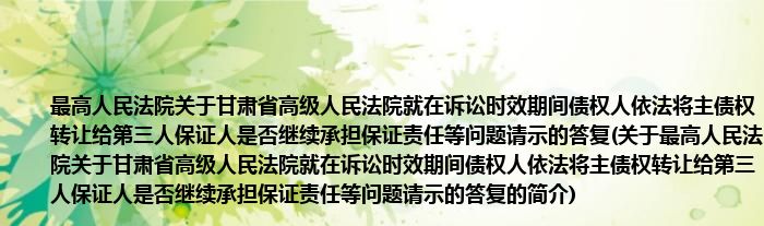 本文关于最高人民法院关于甘肃省高级人民法院就在诉讼时效期间债权人依法将主债权转让给第三人保证人是否继续承担保证责任等问题请示的答复的简介就讲解完毕,希望对大家有所帮助。