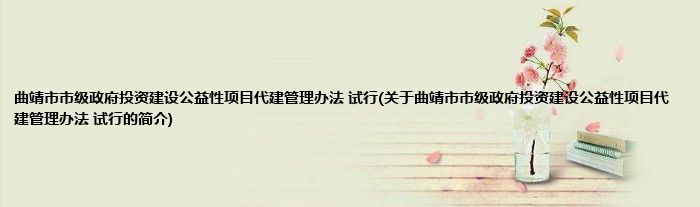 大家好,曲靖市市级政府投资建设公益性项目代建管理办法 试行,关于曲靖市市级政府投资建设公益性项目代建管理办法 试行的简介很多人还不知道,现在让我们一起来看看吧!