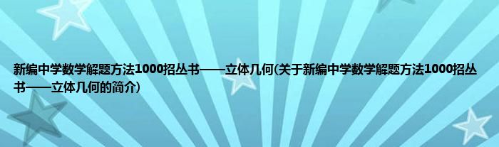 本文关于新编中学数学解题方法1000招丛书——立体几何的简介就讲解完毕,希望对大家有所帮助。
