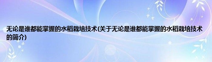 本文关于无论是谁都能掌握的水稻栽培技术的简介就讲解完毕,希望对大家有所帮助。