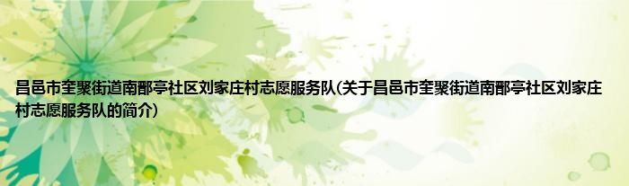 1、 昌邑市奎聚街道南鄑亭社区刘家庄村志愿服务队是由昌邑市文明办领导下的志愿团体。