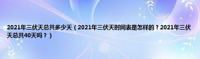 本文,2021年三伏天总共多少天,2021年三伏天时间表是怎样的?2021年三伏天总共40天吗?到此就分享完毕,希望对大家有所帮助。